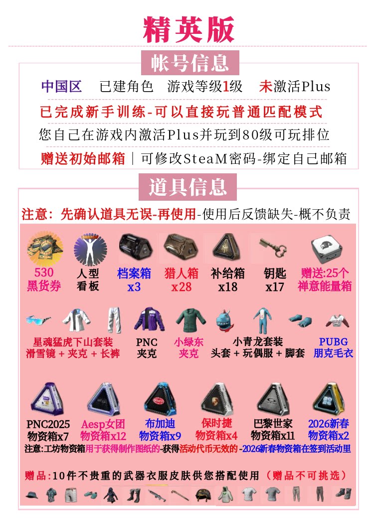 1.本商品为Steam已入库PUBG正版账号