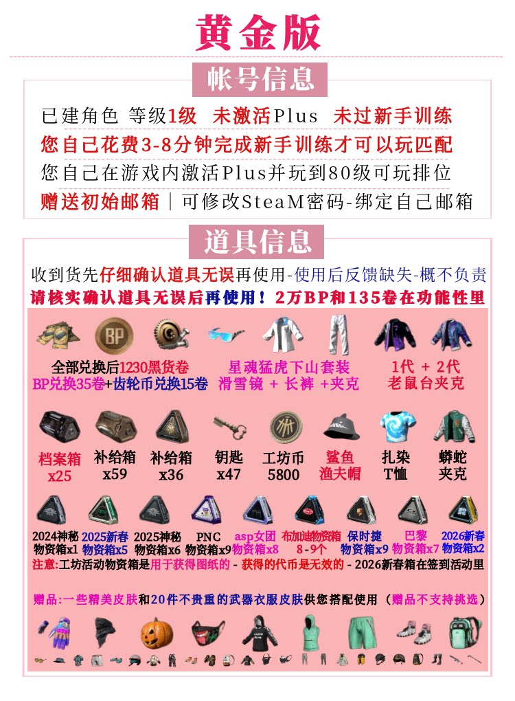 购买说明:绝地求生【黄金版】成品账号来自官方渠道,支持极速发货、错误包换,如有需要可关注http://www.kardzvip.com/detail/1578290422.html