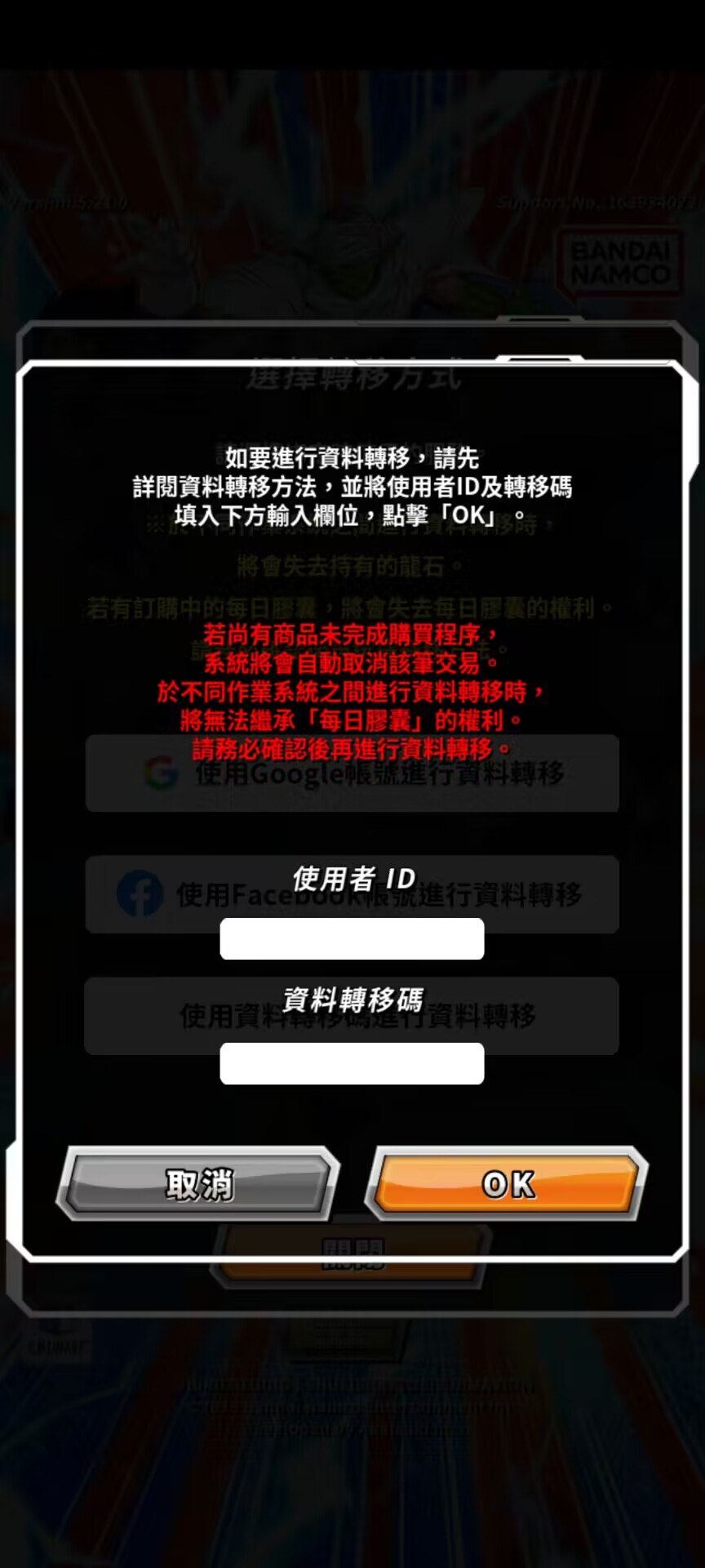 【需要信息】账号(使用者ID)、密码(资料转移码)、角色名