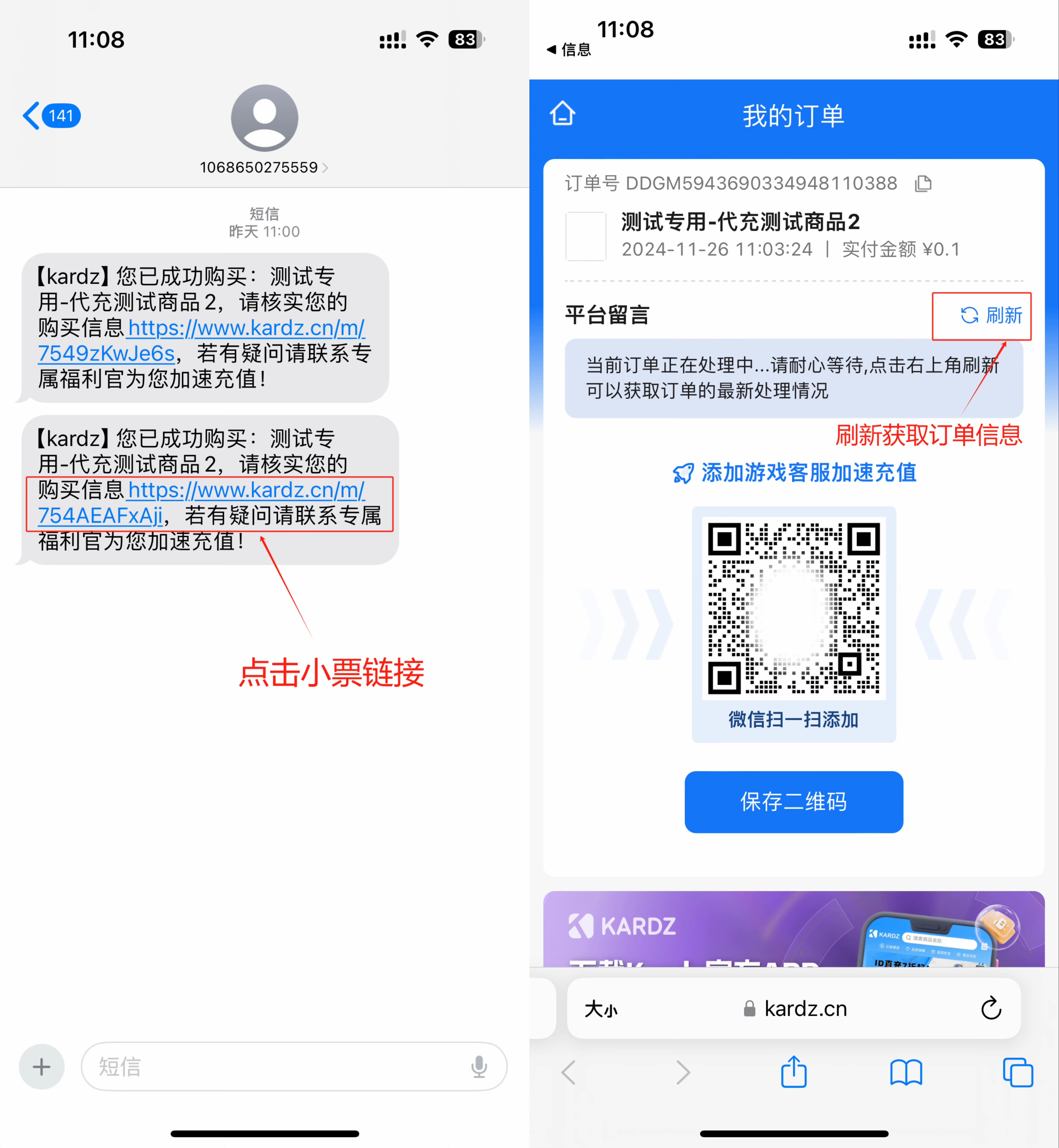 ①购买订单后平台将会自动发送一条短信到您的手机,您可点击短信内小票链接进行查看,如下图所示;