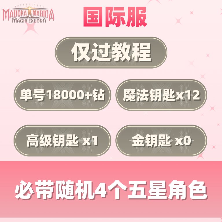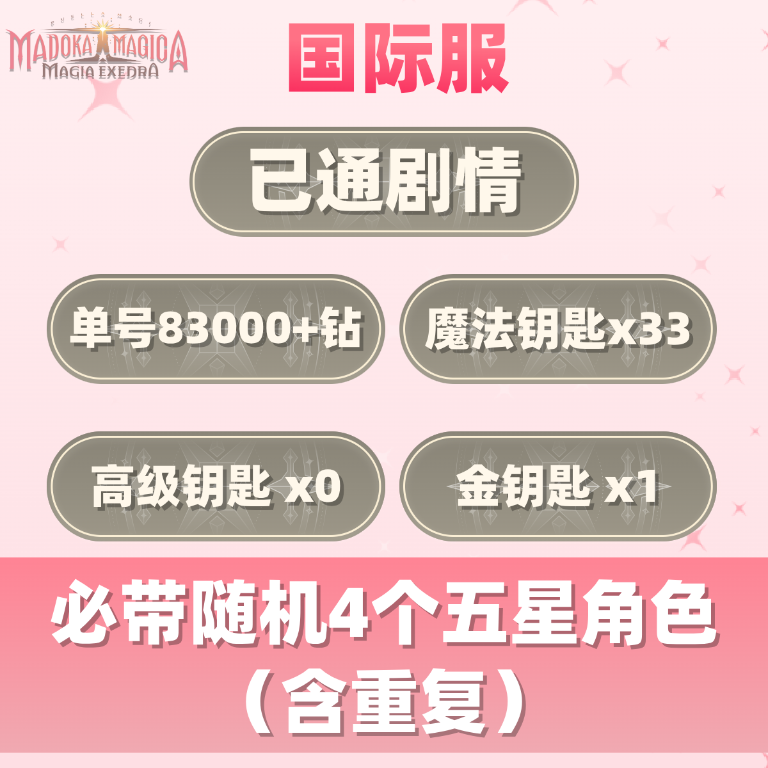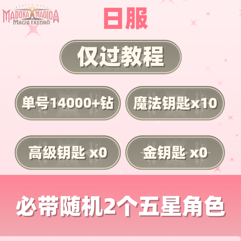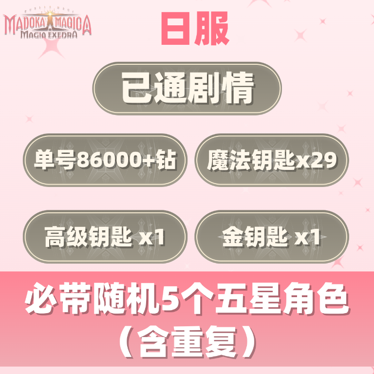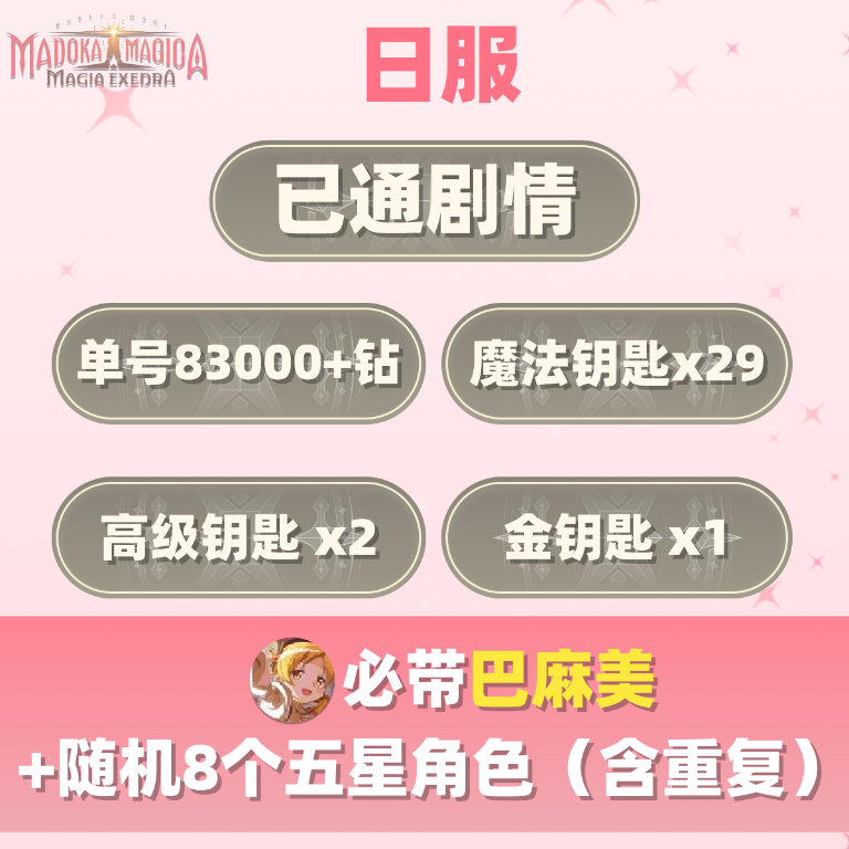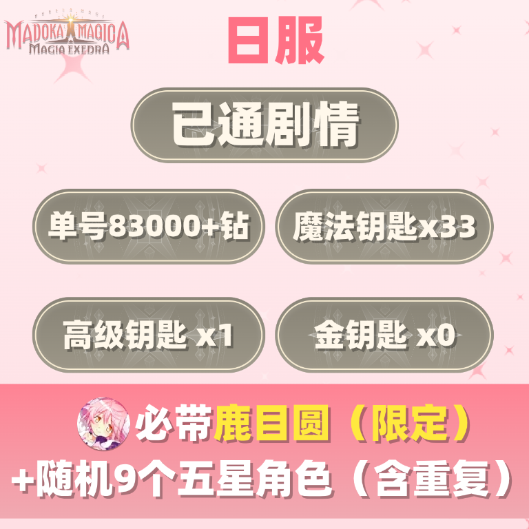 自抽组合包4(日服):已通剧情+83000钻+魔法钥匙x33+金钥匙x2+必带鹿目圆+随机9个五星角色(含重复)