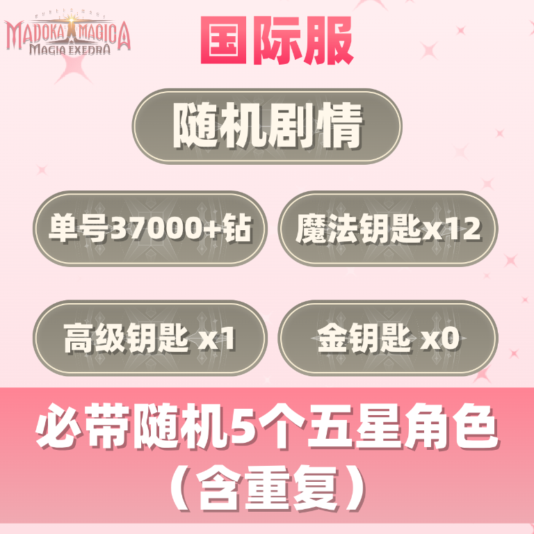 自抽组合包11(国际服):随机剧情+37000钻+魔法钥匙x12+金钥匙x0+必带机5个五星角色(含重复)
