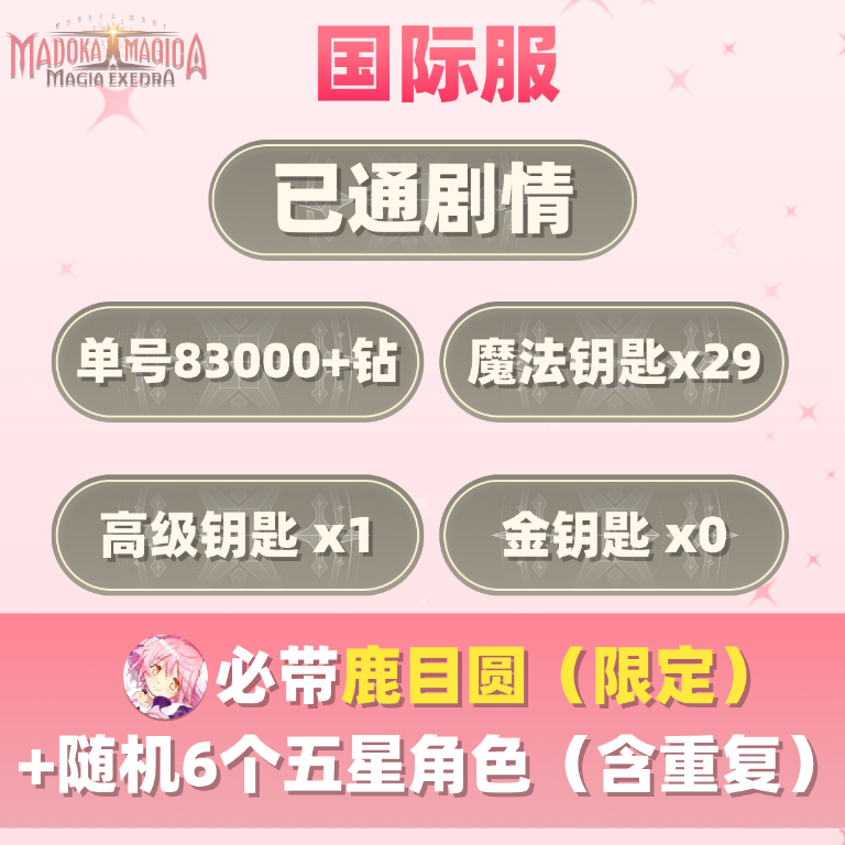 自抽组合包14(国际服):已通剧情+83000钻+魔法钥匙x29+金钥匙x2+必带鹿目圆(限定)+随机6个五星角色(含重复)
