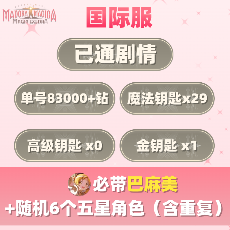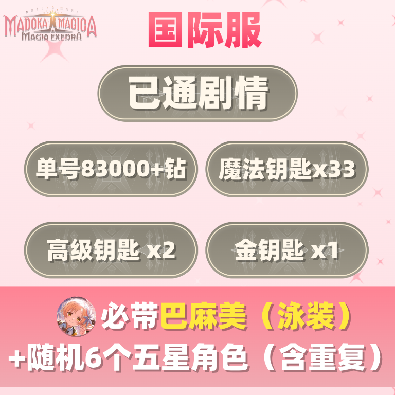 自抽组合包15(国际服):已通剧情+83000钻+魔法钥匙x29+金钥匙x2+必带巴麻美+随机6个五星角色(含重复)