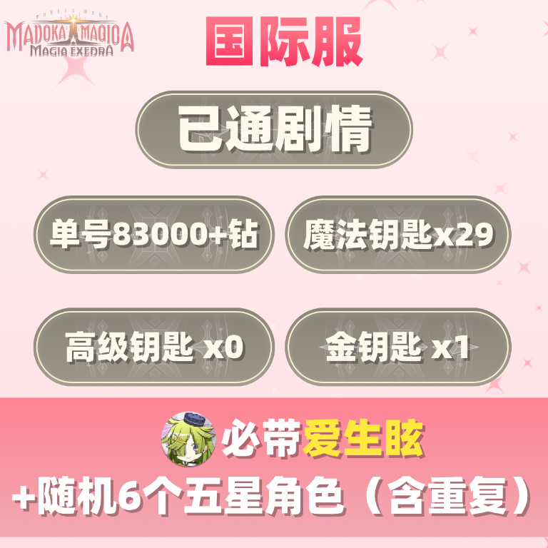 自抽组合包16(国际服):已通剧情+83000钻+魔法钥匙x29+金钥匙x2+必带爱生眩+随机6个五星角色(含重复)