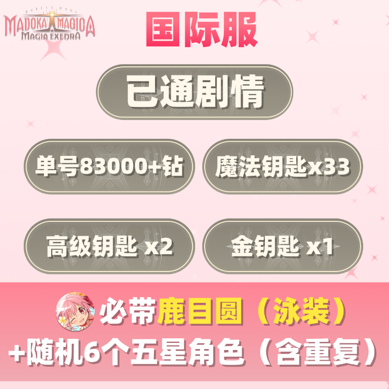 自抽组合包17(国际服):已通剧情+83000钻+魔法钥匙x33+金钥匙x2+必带鹿目圆(泳装)+随机6个五星角色(含重复)