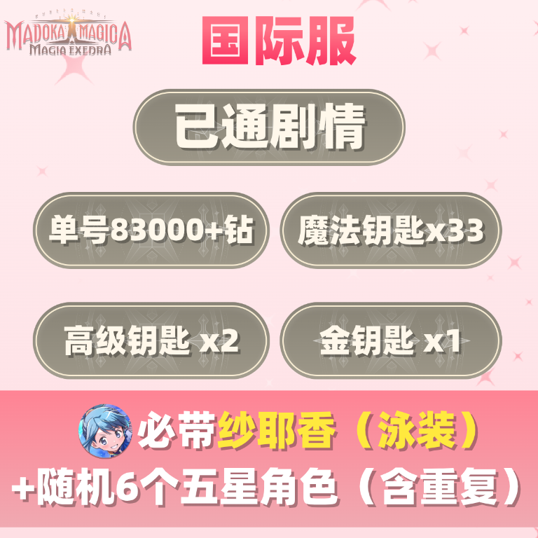 自抽组合包19(国际服):已通剧情+73000钻+魔法钥匙x33+金钥匙x2+必带纱耶香(泳装)+随机6个五星角色(含重复)