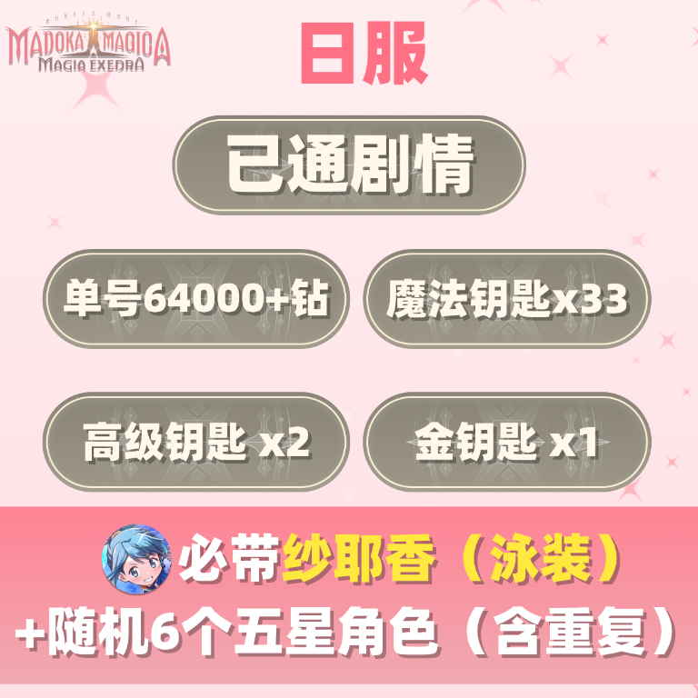 自抽组合包5(日服):已通剧情+64000钻+魔法钥匙x33+金钥匙x3+必带沙耶香(泳装)+随机6个五星角色(含重复)