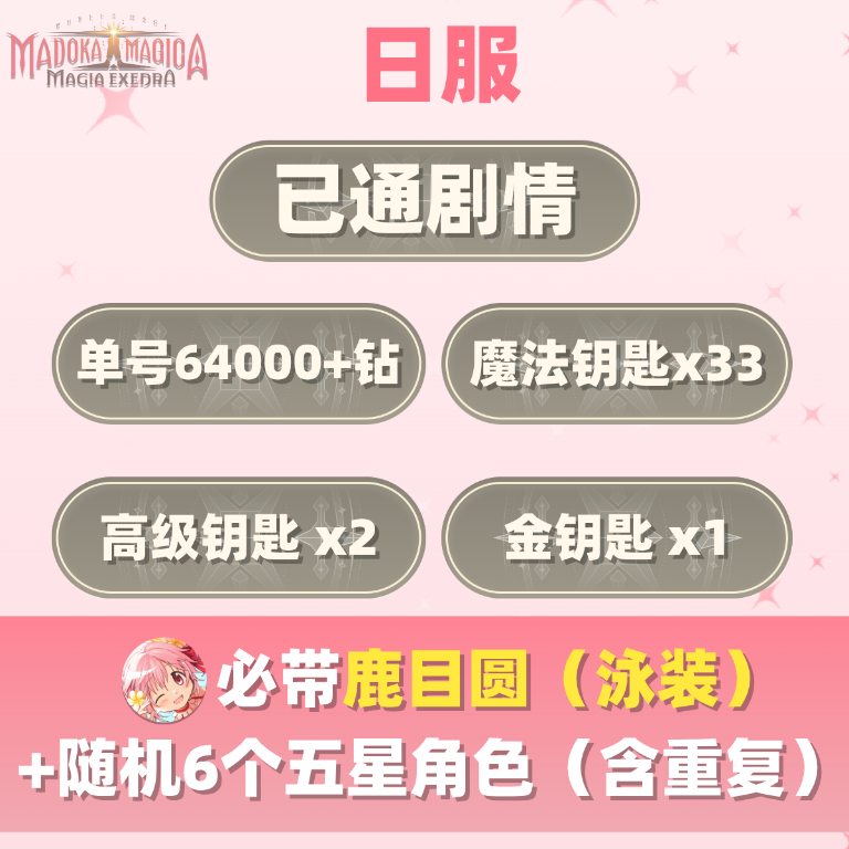 自抽组合包8(日服):已通剧情+64000钻+魔法钥匙x33+金钥匙x2+必带鹿目圆(泳装)+随机6个五星角色(含重复)