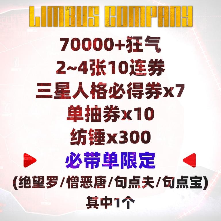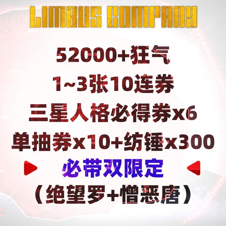 自选号9:52000+狂气+1~3张10连券+三星人格必得券x6+单抽券x10+纺锤x300+必带双限定(绝望罗+憎恶唐)