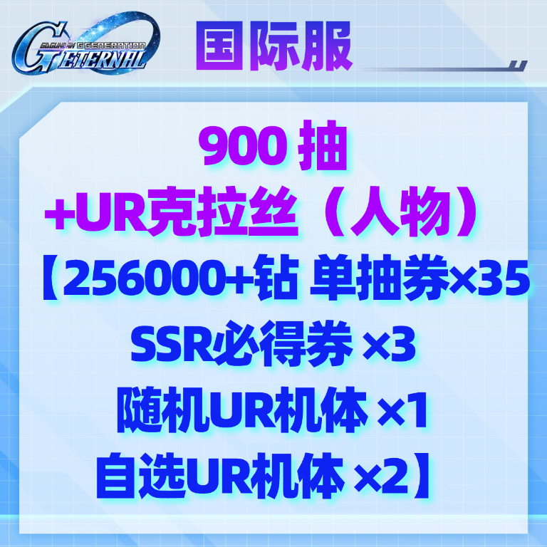自选5(国际服):900抽+UR克拉丝(人物)【256000+钻 单抽券×35 SSR必得券×3 随机UR机体×1 自选UR机体×2】