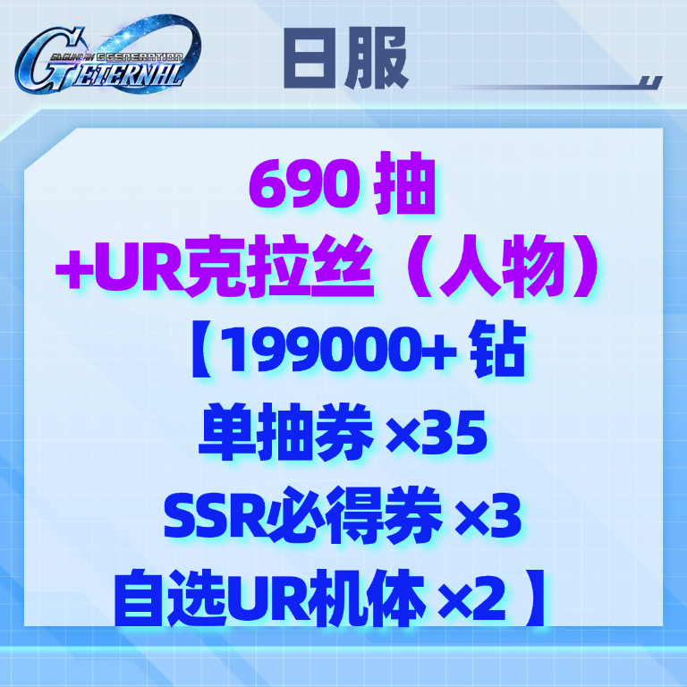 自选8(日服):690抽+UR克拉丝(人物)【199000+钻 单抽券×35 SSR必得券×3 自选UR机体×2】