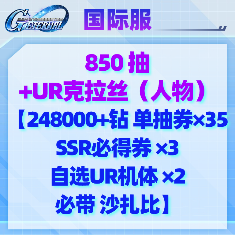 自选4(国际服):850抽+UR克拉丝(人物)【248000+钻 单抽券×35 SSR必得券×3 自选UR机体×2 必带沙扎比】