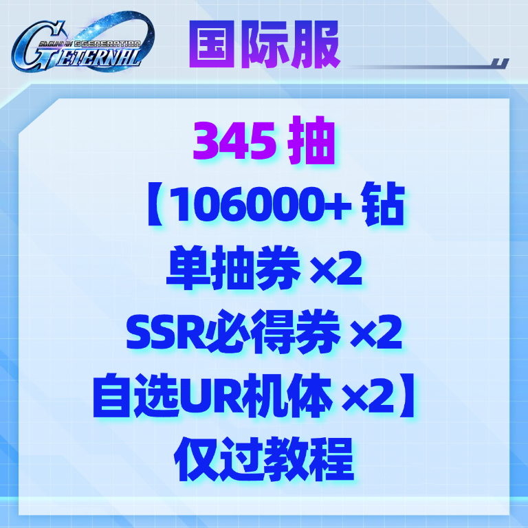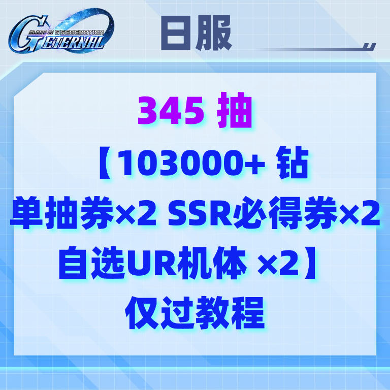 自选1(国际服):345抽【106000+钻 单抽券×2 SSR必得券×2 自选UR机体×2】仅过教程