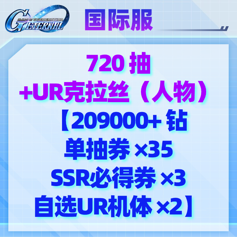 自选3(国际服):720抽+UR克拉丝(人物)【209000+钻 单抽券×35 SSR必得券×3 自选UR机体×2】