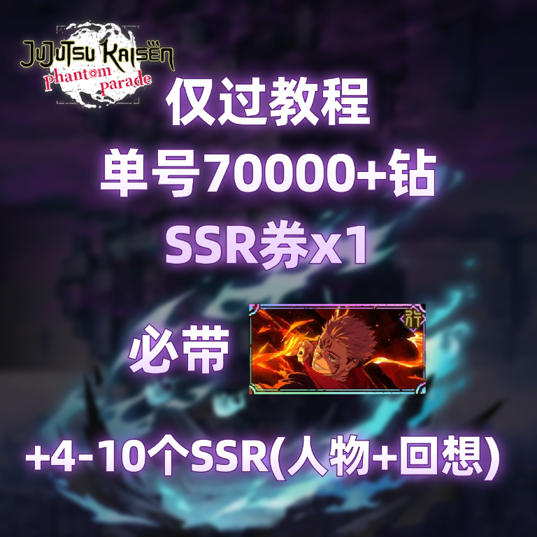 自选号7:仅过教程+70000钻+SSR券x1+必带【火力胜负】两面宿傩+4-10个SSR(人物+回想)