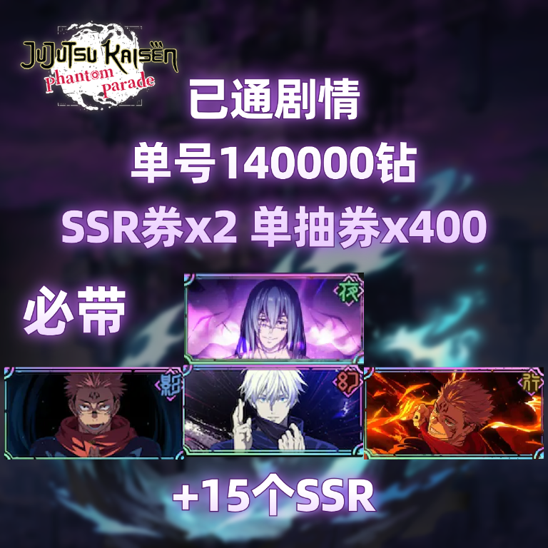 自选号30:已通剧情+140000钻+SSR券x2+单抽券x400+必带【由死而生的灵感】真人+【真正的咒术】两面宿傩+【无下限的内侧】五条悟+【火力胜负】两面宿傩+15个SSR