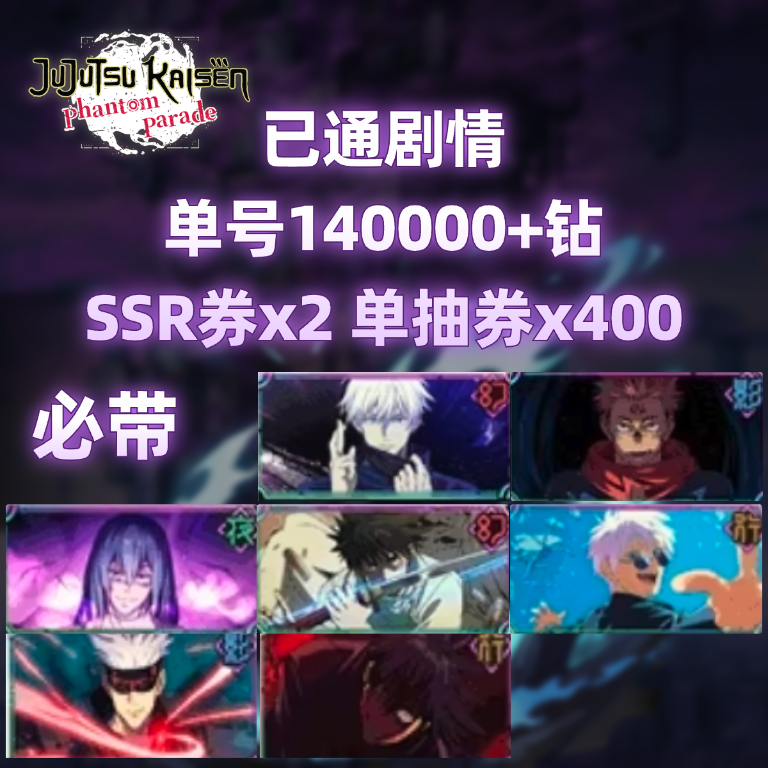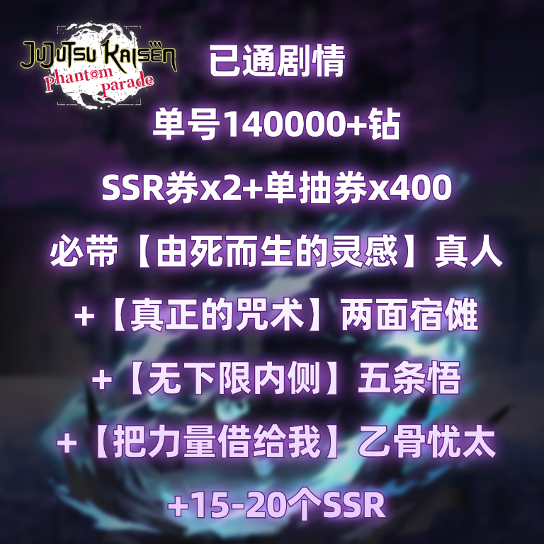 自选号30:已通剧情+140000钻+SSR券x2+单抽券x400+必带【由死而生的灵感】真人+【真正的咒术】两面宿傩+【无下限的内侧】五条悟+【把力量借给我】乙骨忧太+15个SSR