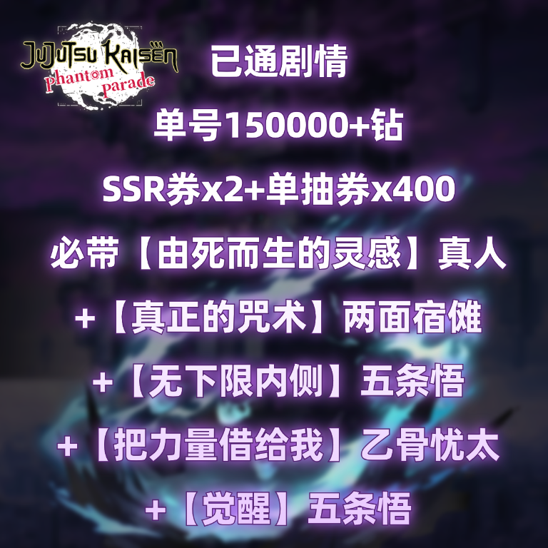 自选号32:已通剧情+150000钻+SSR券x2+单抽券x400+必带【由死而生的灵感】真人+【真正的咒术】两面宿傩+【无下限的内侧】五条悟+【把力量借给我】乙骨忧太+【觉醒】五条悟