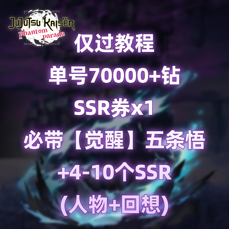 自选号9:仅过教程+70000钻+SSR券x1+必带【觉醒】五条悟+4-10个SSR(人物+回想)