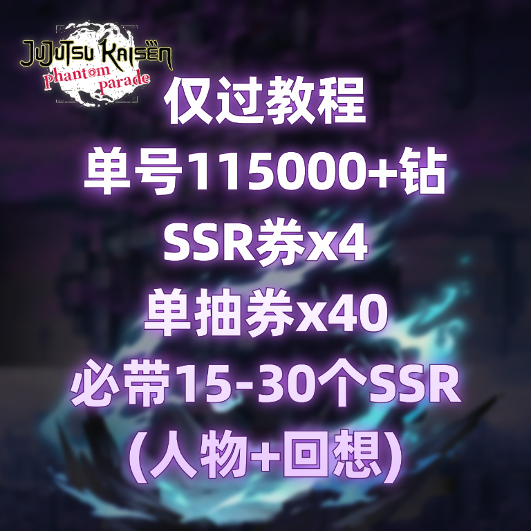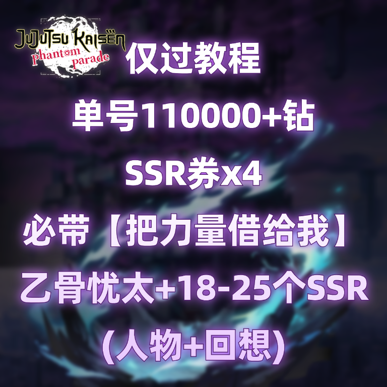 自选号19:仅过教程+110000钻+SSR券x4+必带【把力量借给我】乙骨忧太+18-25个SSR(人物+回想)