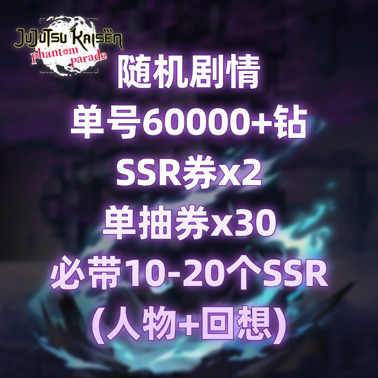 自选号1:随机剧情+60000钻+SSR券x2+单抽券x30+必带10-20个SSR(人物+回想)