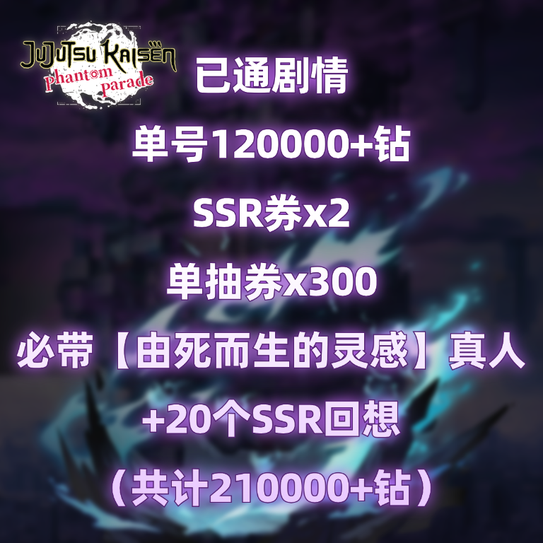自选号25:已通剧情+14000钻+SSR券x2+单抽券x300+必带【由死而生的灵感】真人+【觉醒】五条悟+20个SSR回想(共计215000钻)