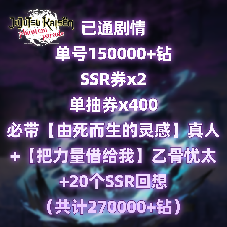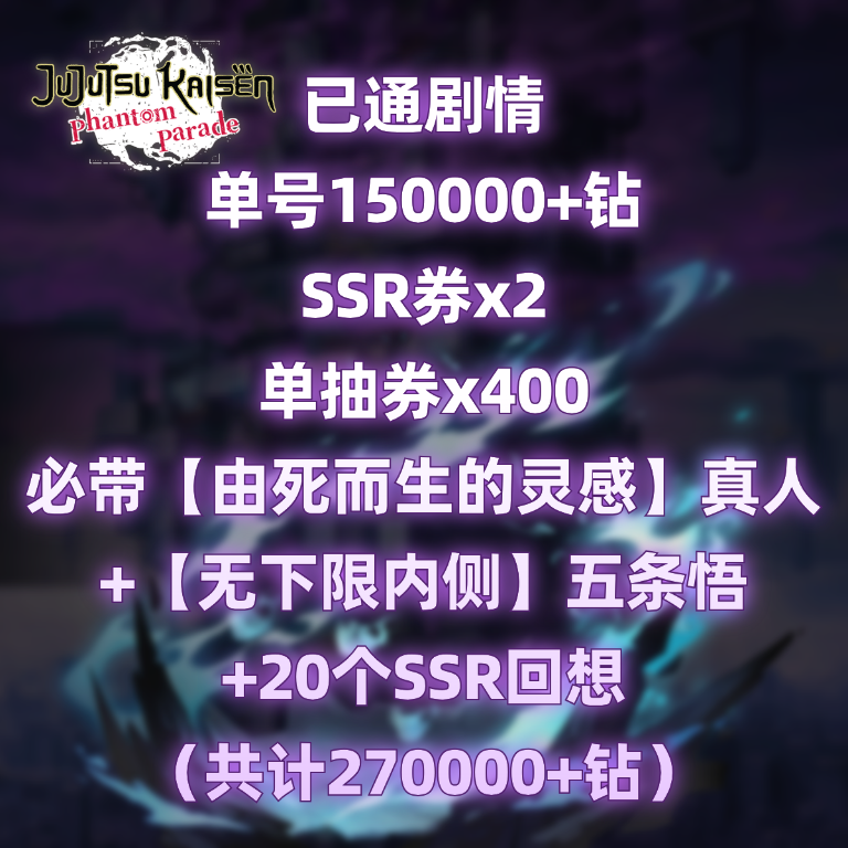 自选号22:已通剧情+140000钻+SSR券x2+单抽券x400+必带【由死而生的灵感】真人+【把力量借给我】乙骨忧太+20个SSR回想(共计270000钻)